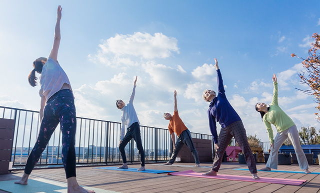 屋上テラス「ソラ庭」では、高齢の方でも無理なく使える健康器具をご用意しています。青空の下、三鷹の街を望みながら心身ともにリフレッシュ。